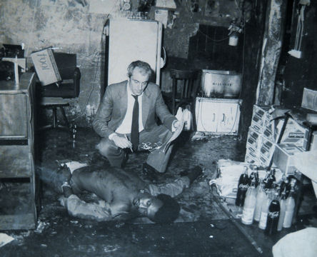 Sur cette photo d'archive très dure, le comissaire Philippe Féval "procède aux constatations d'usage autour du cadavre d'une victime. C'est un 31 décembre. Il est minuit...", précisent les auteurs de l'ouvrage. © Editions Jacob-Duvernet - DR